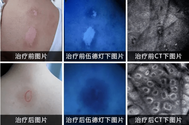 治療后:伍德燈下背部白斑消失,皮膚CT下黑色素細胞明顯增多,療效顯著。